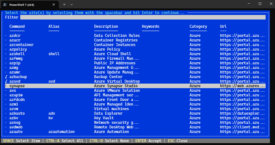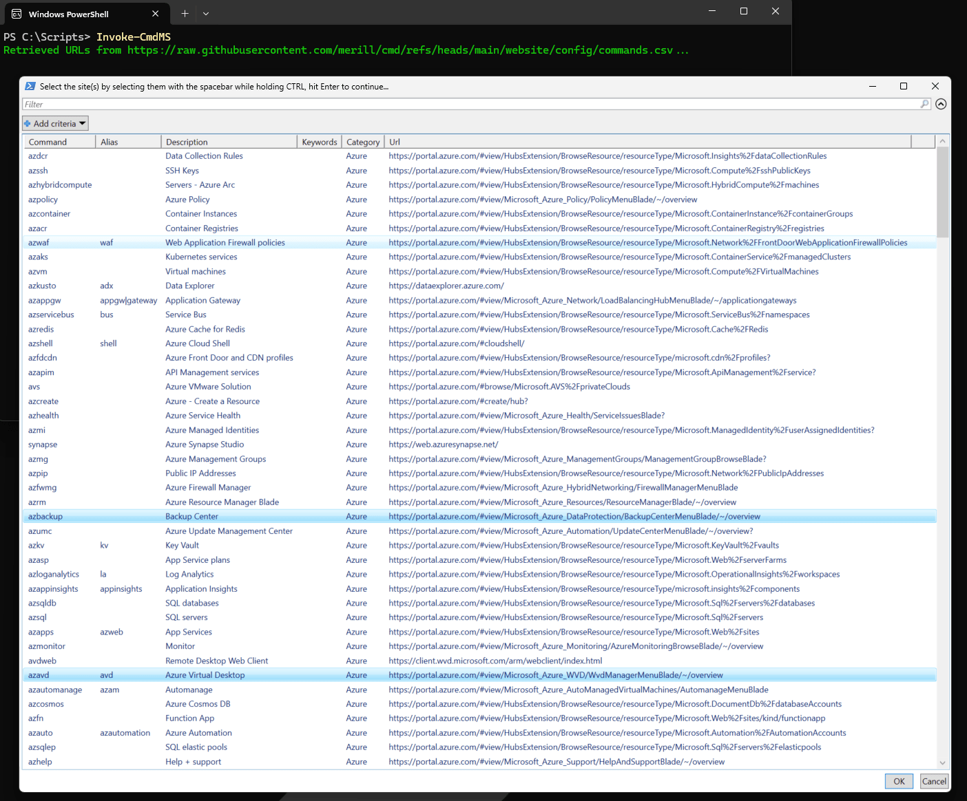 Below is an example of running Invoke-CmdMS in PowerShell v5 in which I choose two links (Backup Center and Azure Virtual Desktop) by holding CTRL and selecting them with my mouse. (Holding CTRL and using Spacebar also works) :