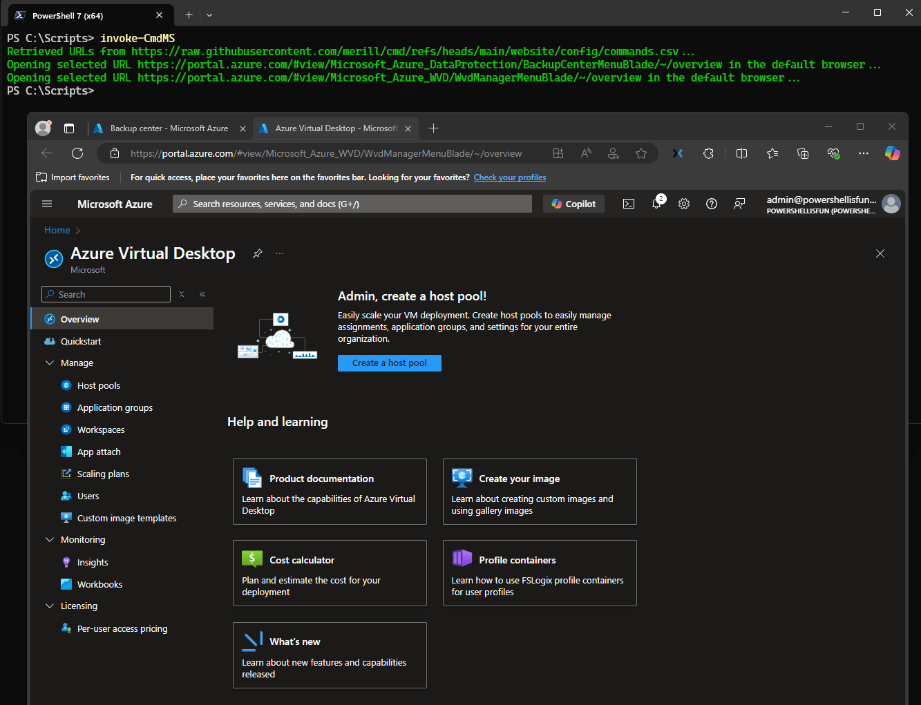 This is similar to the chapter above, but in PowerShell v7, Out-ConsoleGridView is used instead of Out-Gridview. I ran “Invoke-CmdMS” and selected the same links (Backup Center and Azure Virtual Desktop) with my mouse. (Using Spacebar also works)