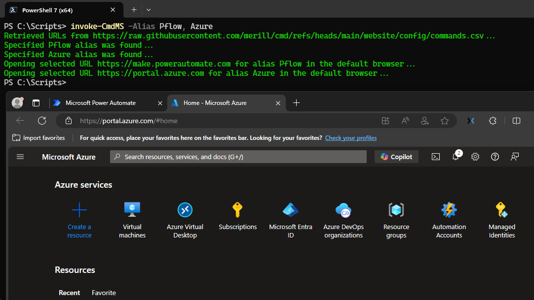In the example below, I used “Invoke-CmdMS -Alias Pflow, Azure” to open the Power Automate admin center and the Azure portal directly without selecting them from a list. (If the alias(es) were not found, it would display a warning about that)