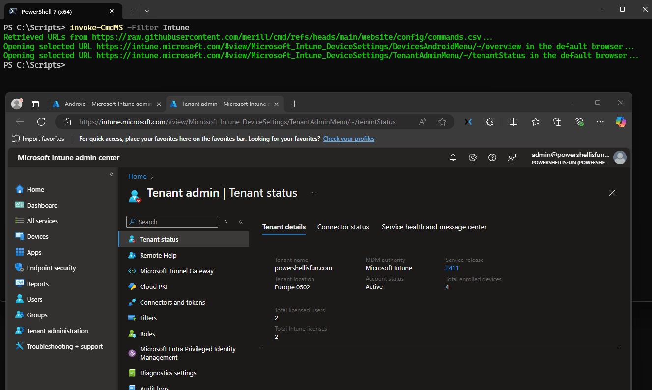 In the example below, I ran “Invoke-CmdMS -Filter Intune” to show all the Intune links, of which I selected two (Android and Tenant Admin), which were opened in my default browser (Microsoft Edge)