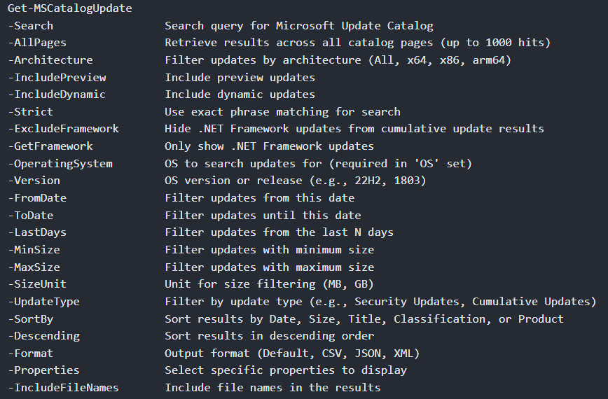 This Cmdlet will allow you to find a specific update, or updates, based on Architecture, Data, Size, Type (For example, Security Updates, Cumulative Updates, etc), Operating System, and more. These are the Parameters you can use: