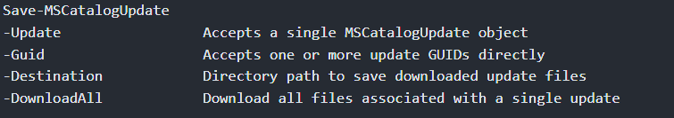 This Cmdlet will save the download(s) for a specific Update to your local hard drive. These are the Parameters that you can use:
