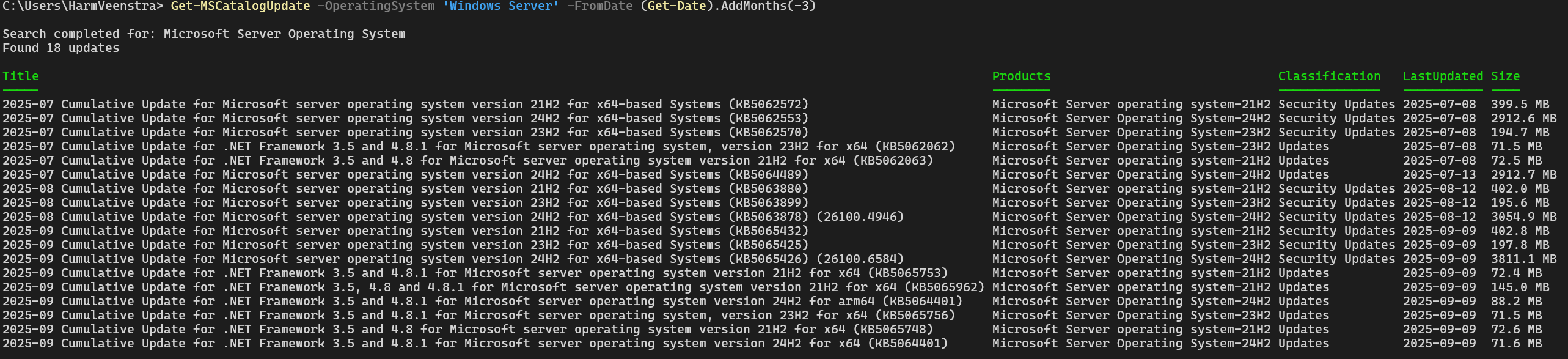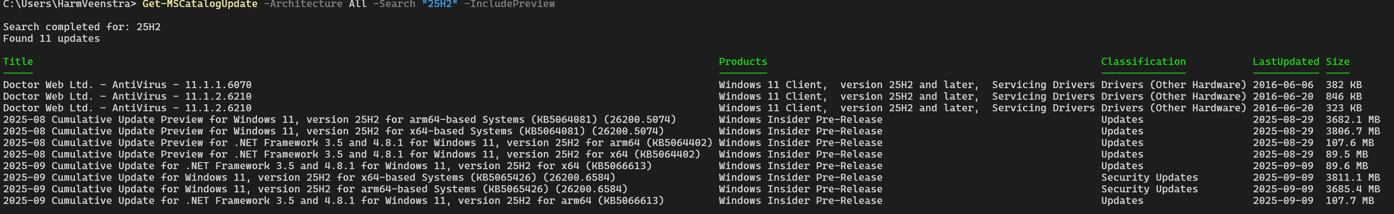 In this example, I used Get-MSCatalogUpdate to search for all 25H2 updates, including Preview versions, and it returned this:
