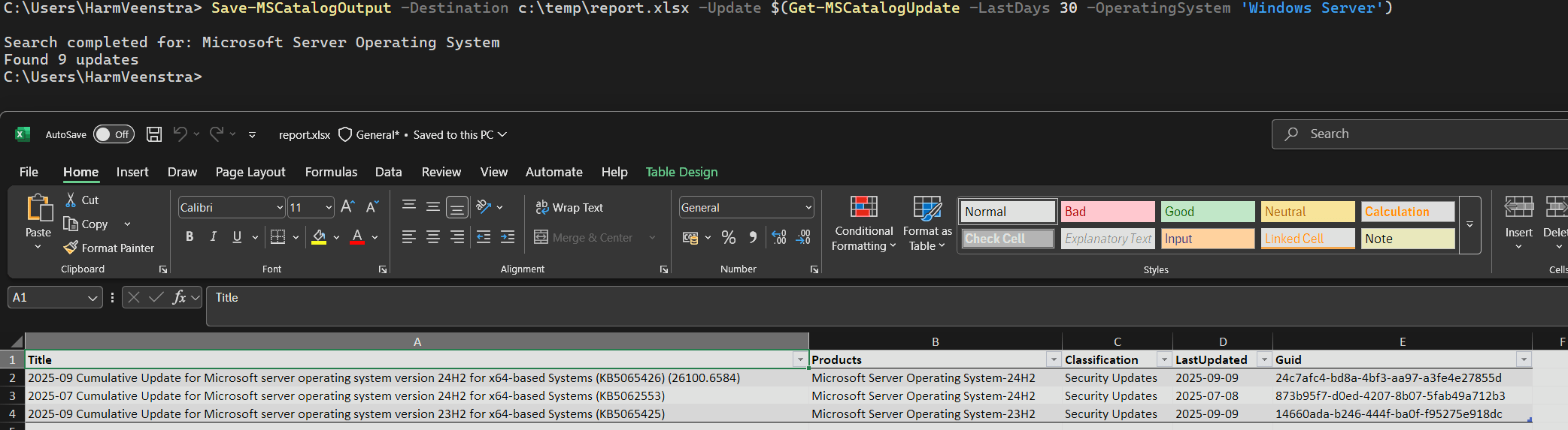 In the example above, I searched for updates from the last month and exported them to an Excel sheet in C:\Temp. It only has three unique updates, KB numbers, so three results instead of the nine in total. (It puts them together in unique ones)