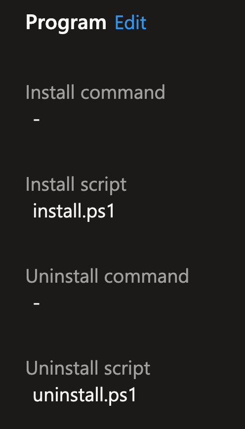 You can see that the Win32 package doesn’t use Install or Uninstall commands; instead, it uses Install and Uninstall scripts. When you edit the properties, you will see the scripts, and these are clickable:
